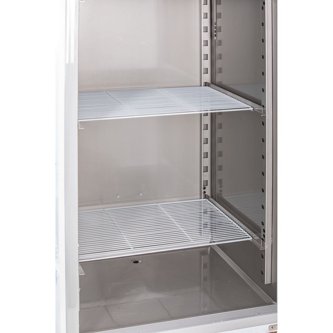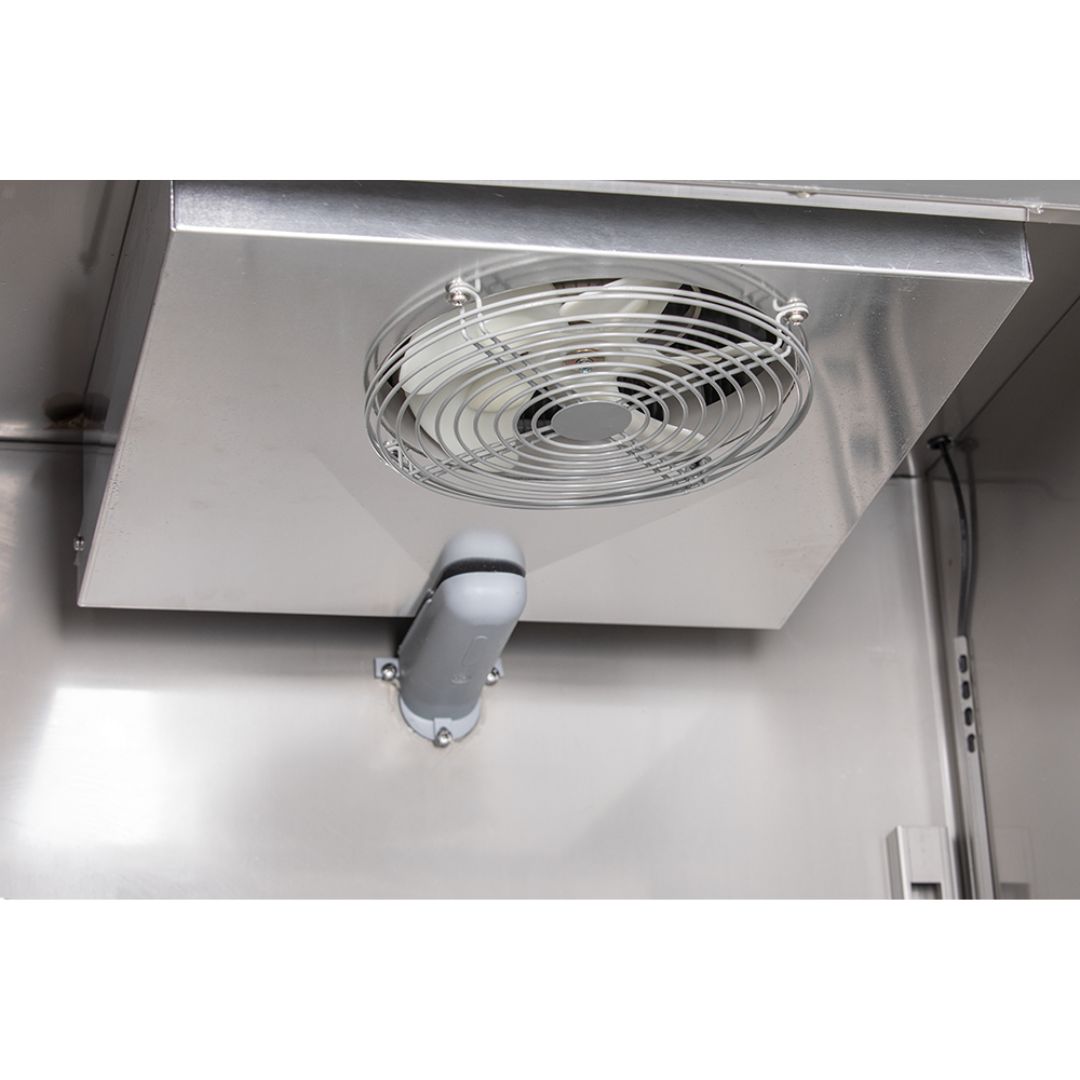 Bäckerei Umluft Edelstahl-Gewerbe-Kühlschrank für Rostmass 600 x 400 mm mit elektronischerSteuerung und digitaler Temperaturanzeige. Die selbstschließende Tür ist bei90° Öffnung arretierend und mit einer leicht wechselbaren Magnetsteckdichtungversehen. Gegen unbefugten Zugriff kann der Gewerbekühlschrank mit demeingebautem Schloss gesichert werden. Zum leichten öffnen des Kühlschrankes verfügtdie Edelstahl-Tür über eine senkrechte eingelassene Griffleiste. Eine automatischeAbtauung und die energiesparende Heißgas-Tauwasserverdunstung bieten maximalenKomfort. Der Innenraum komplett aus Edelstahl gefertigt besitzt im Boden zurleichten Reinigung einen Ablauf. Serienmäßig wird der BäckereiGewerbekühlschrank mit 3 rilsalnierten Rosten ausgeliefert. Maximal können inden großen Innenraum bis zu 20 Roste oder Backblecke EN 600 x 400 mm mit einemAbstand von 60 mm zueinander eingebracht werden. Vor Ort bestehendeBodenunebenheiten können durch die höhenverstellbaren Edelstahl-Füße (125 bis200 mm) ausgeglichen werden.