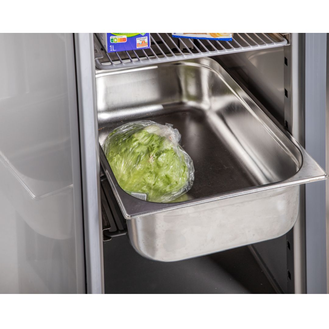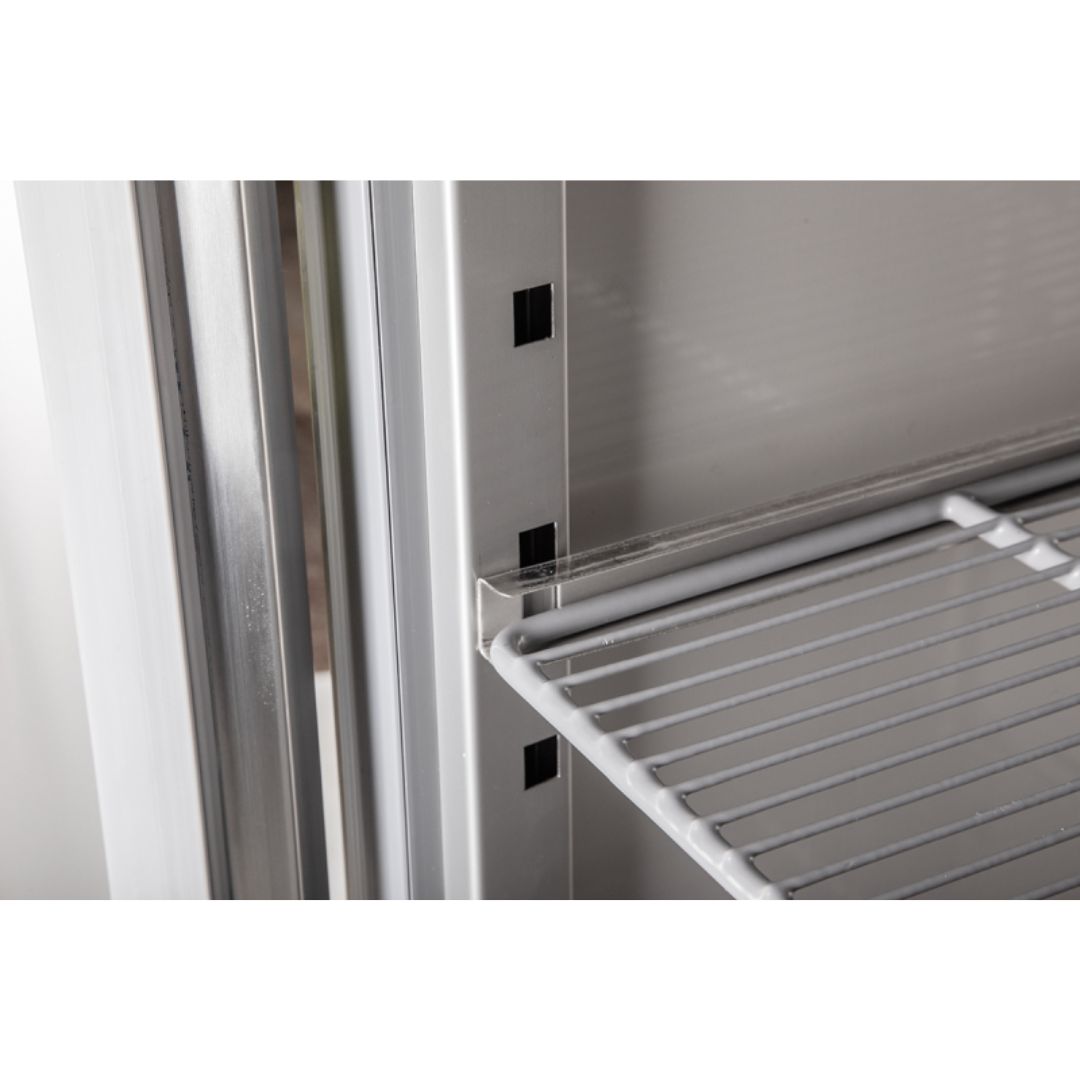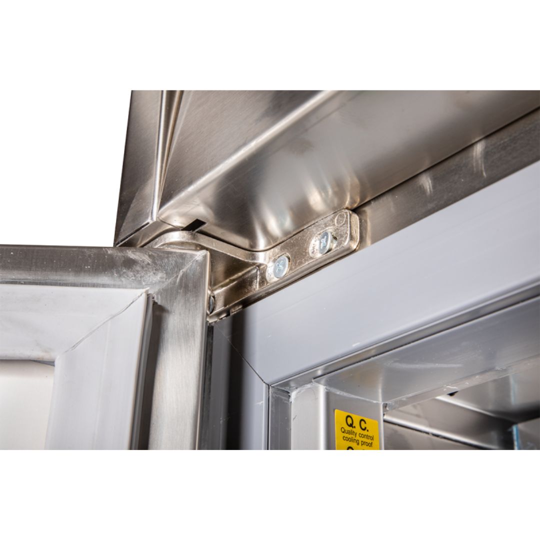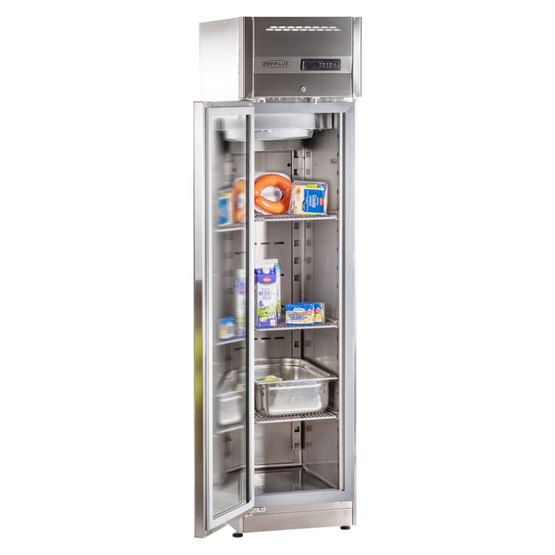Umluft Gewerbe Kühlschank mit Glastür und elektronischer Steuerung. Frontblende servicefreundlich klappbar, Selbstschließende Tür mit linkem Türanschlag. Servicefreundliche gesteckte und wechselbare Magnetdichtung. Edelstahl-Glastür mit ergonomisch geformter und eingelassener Griffleiste. Der Kühlschrank verfügt über eine automatische Abtauung und Tauwasserverdunstung und einem im Innenraum liegenden und beschichteten Verdampfer. Der Boden im Innenraum gerundet, zwecks besserer und hygienischer Reinigung. Die U-Schienen im Innenraum sind ohne Werkzeug herausnehmbar und verstellbar. Bodenunebenheiten können vor Ort über die 4 höhenverstellbare CNS Füße ausgeglichen werden. Produktion des Kühlschrankes erfolgt in Europa.