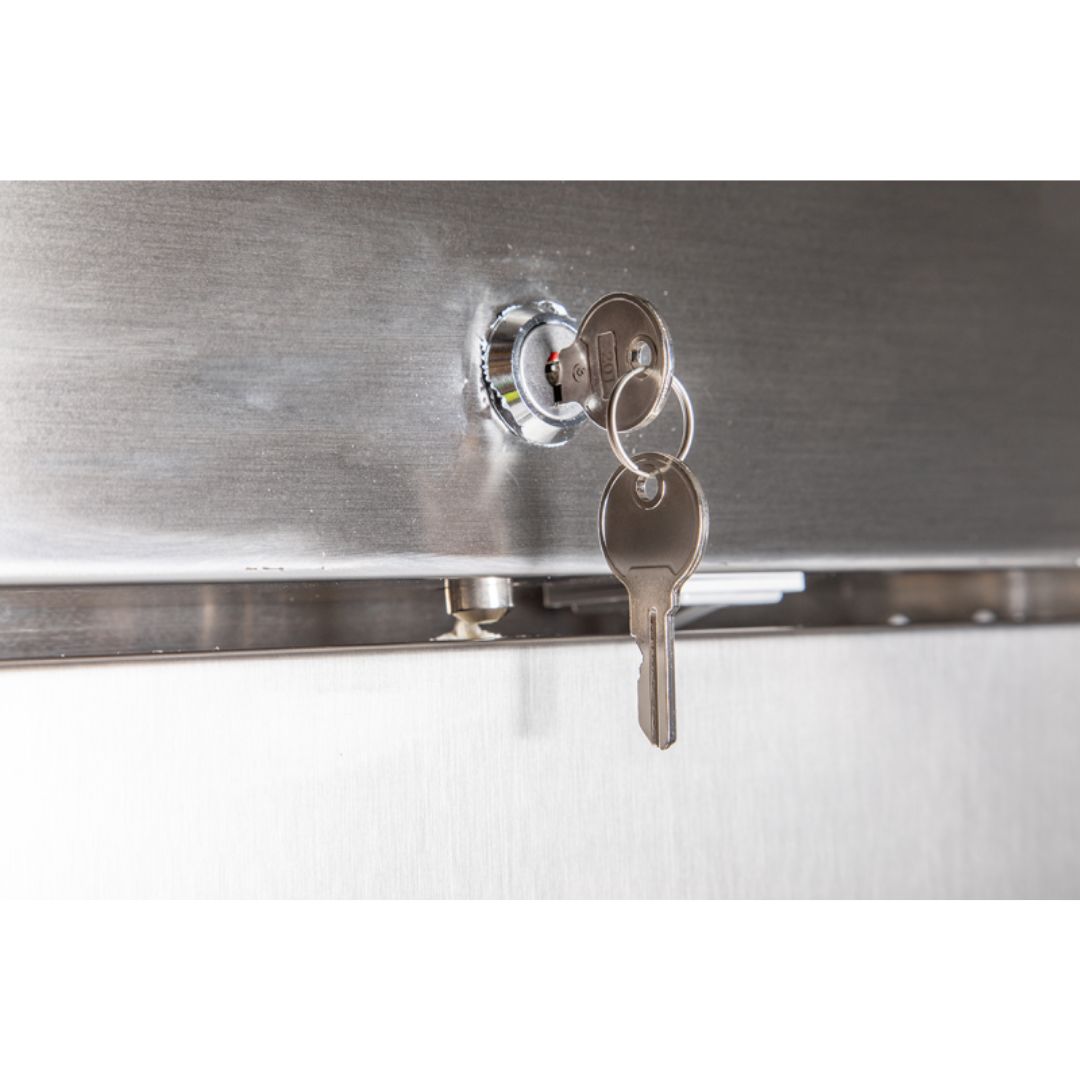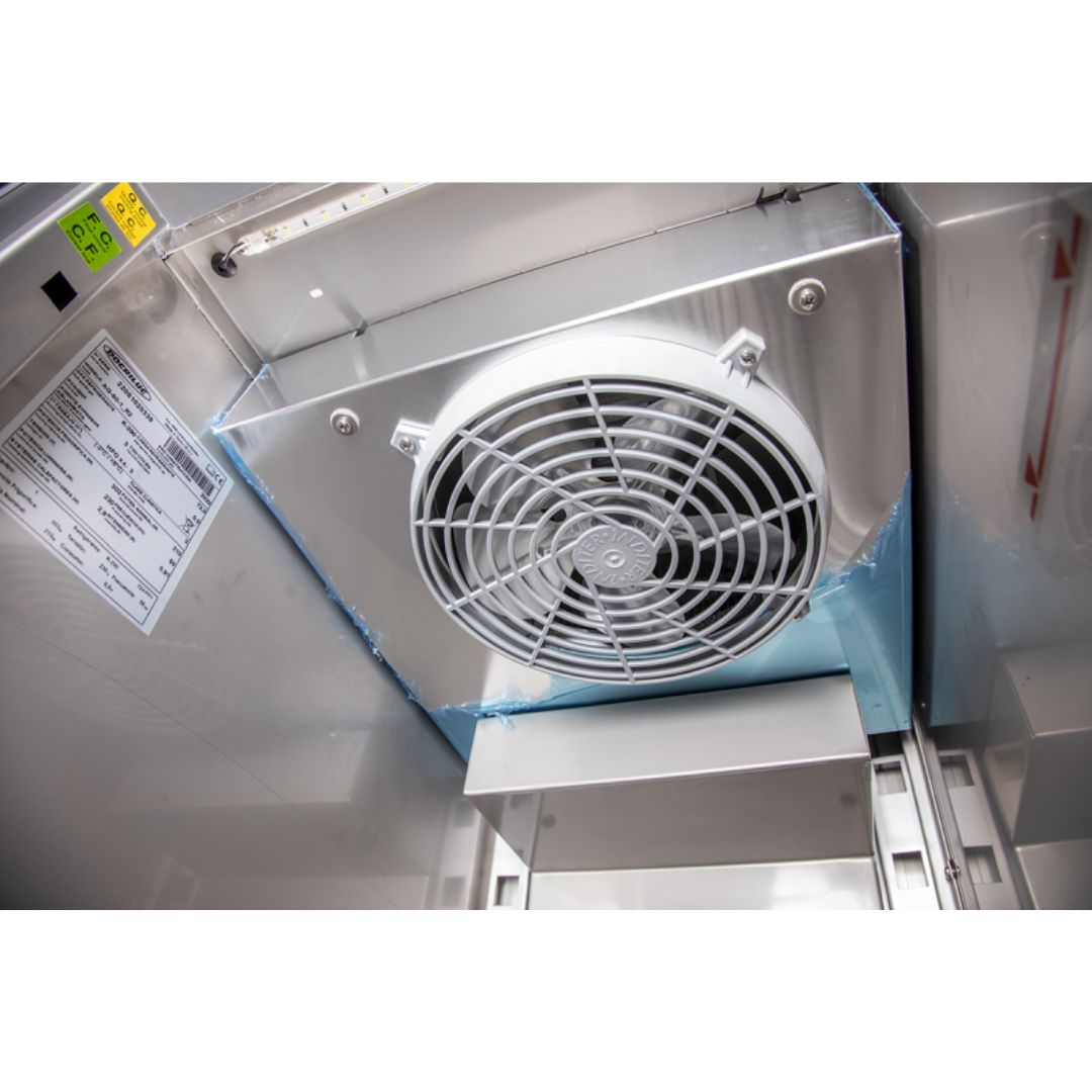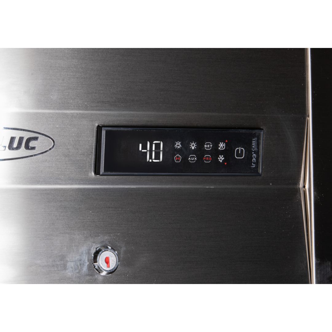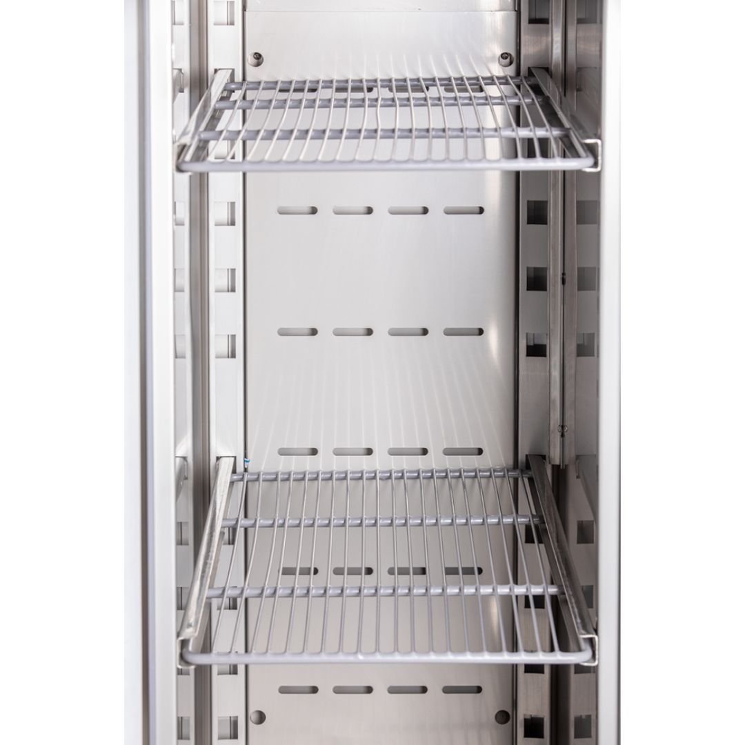 Umluft Gewerbe Kühlschank mit Glastür und elektronischer Steuerung. Frontblende servicefreundlich klappbar, Selbstschließende Tür mit linkem Türanschlag. Servicefreundliche gesteckte und wechselbare Magnetdichtung. Edelstahl-Glastür mit ergonomisch geformter und eingelassener Griffleiste. Der Kühlschrank verfügt über eine automatische Abtauung und Tauwasserverdunstung und einem im Innenraum liegenden und beschichteten Verdampfer. Der Boden im Innenraum gerundet, zwecks besserer und hygienischer Reinigung. Die U-Schienen im Innenraum sind ohne Werkzeug herausnehmbar und verstellbar. Bodenunebenheiten können vor Ort über die 4 höhenverstellbare CNS Füße ausgeglichen werden. Produktion des Kühlschrankes erfolgt in Europa.