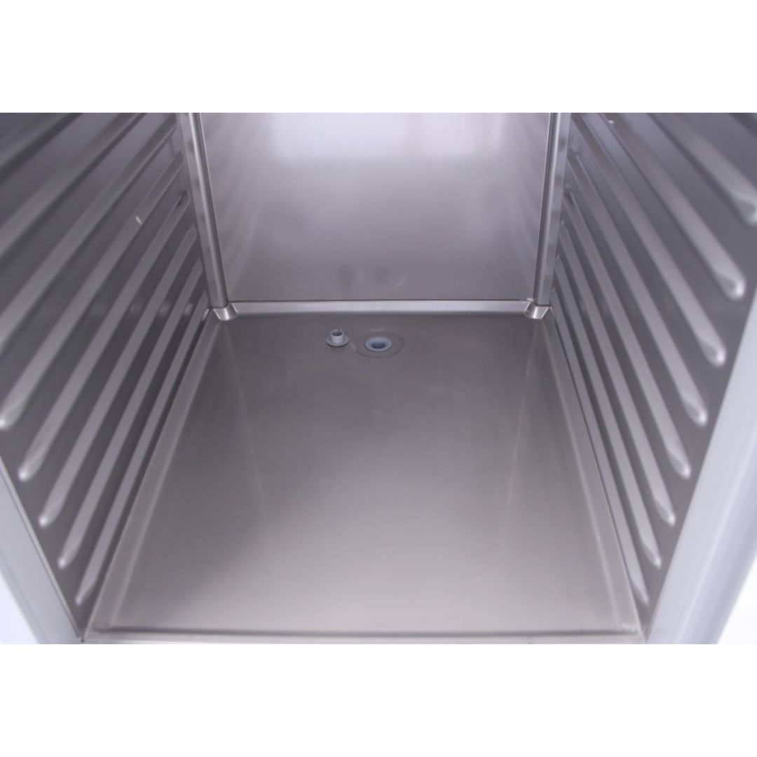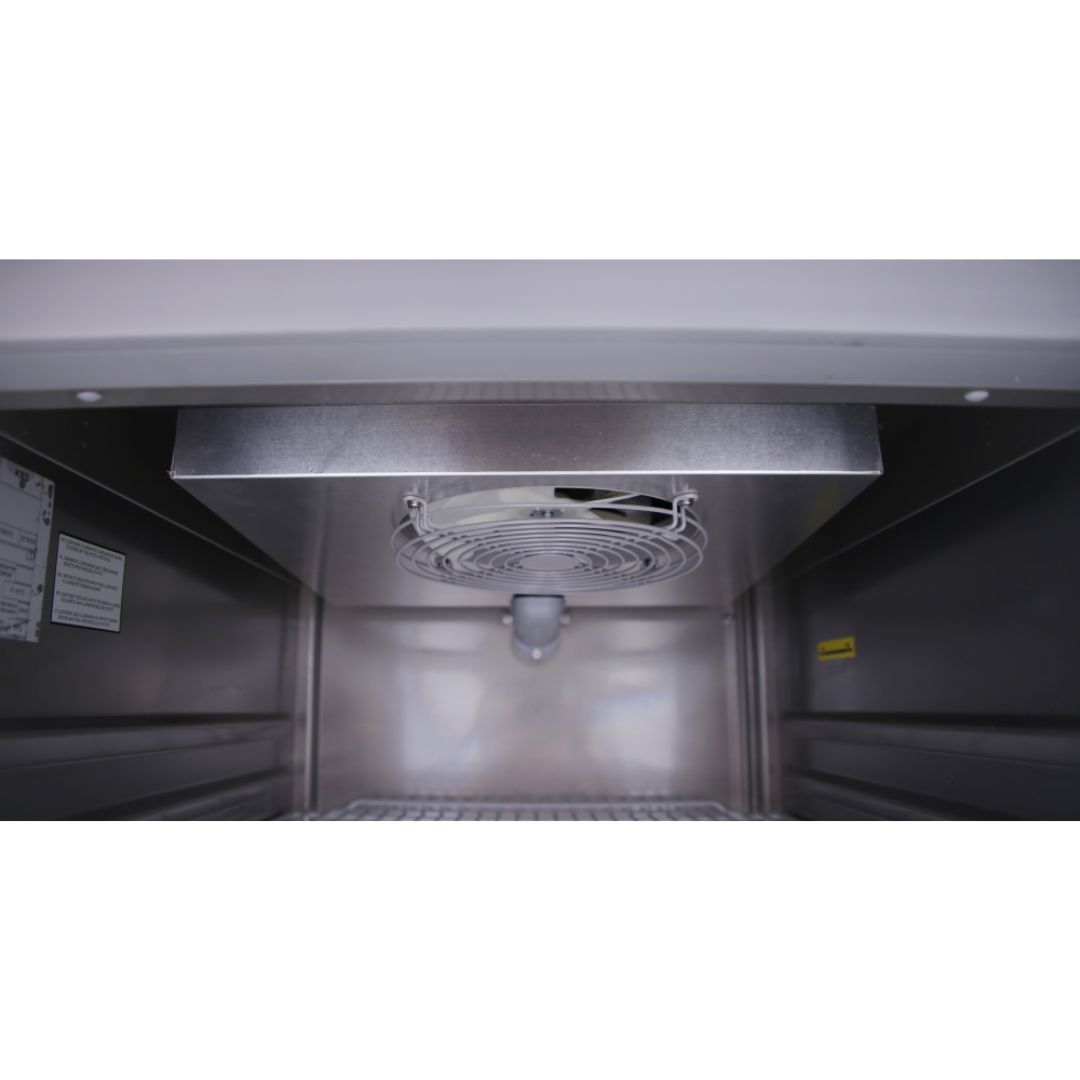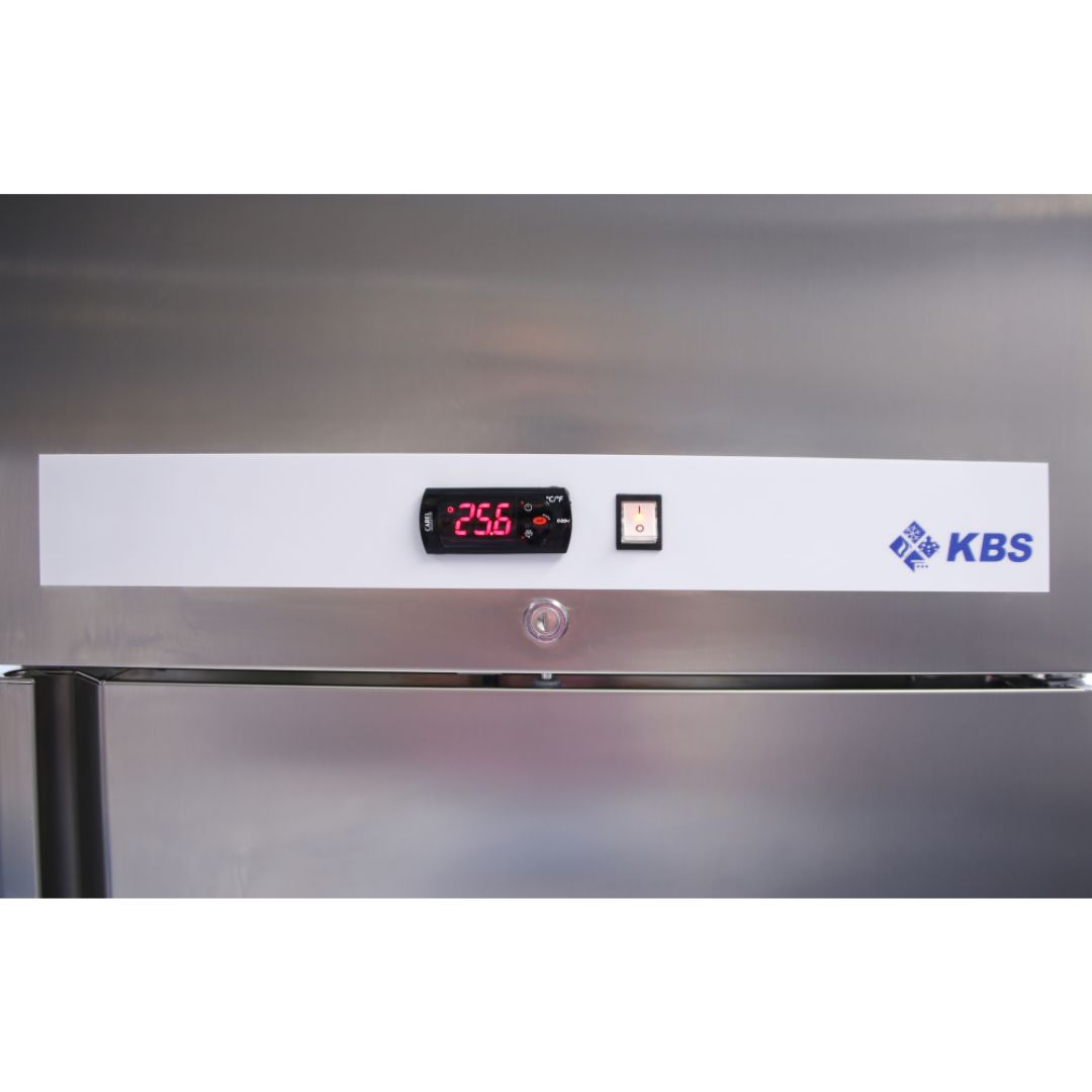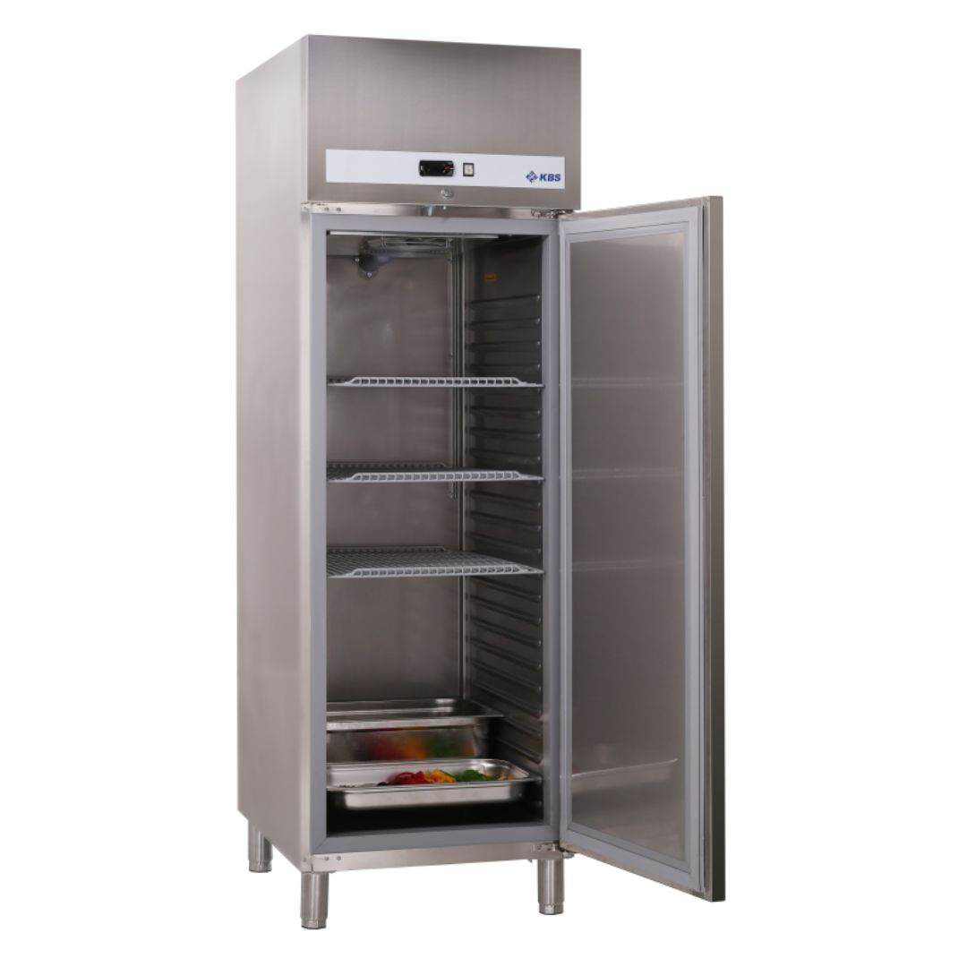 Umluft Edelstahl-Gewerbekühlschrank GN 2/1 mit elektronischer Steuerung und digitaler Temperaturanzeige. Der Gewerbekühlschrank verfügt über eine energiesparende 60 mm Isolierung und einer energiesparenden Heißgas-Tauwasserverdunstung. Hochwertiger Innenraum aus Edelstahl mit tiefgezogenen vorgeformten Auflagenschienen zur Einbringung von maximal 23 Rosten GN 2/1 mit 55 mm Abstand. Im Lieferumfang befinden sich bereits 3 Roste für eine maximale Gewichtsaufnahme je Rost von 40 kg. Edelstahlboden mit Reinigungsablauf und Hygieneradien zur leichten Reinigung. Die selbstschließende Tür ist bei 90° Öffnung arretierend und mit einer leicht wechselbaren Magnetsteckdichtung versehen. Gegen unbefugten Zugriff kann der Gewerbekühlschrank mit dem eingebautem Schloss gesichert werden. Zum leichten öffnen des Kühlschrankes verfügt die Tür über eine senkrechte eingelassene Griffleiste. Eine automatische Abtauung bietet maximalen Komfort. Vor Ort bestehende Bodenunebenheiten können durch die montierten höhenverstellbaren Rund Füße aus Edelstahl ausgeglichen werden.