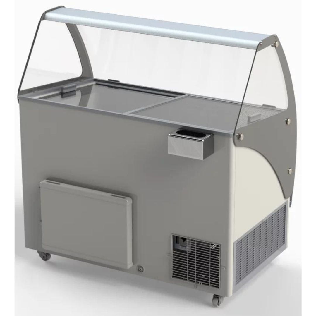 Eisvitrine Elegante 36, Frontscheibe gebogen, statische Kühlung, LED Beleuchtung, für 9 Schalen, zusätzliches Lagerfach mit Tür unten, 4 Rollen, Portionierspüle,