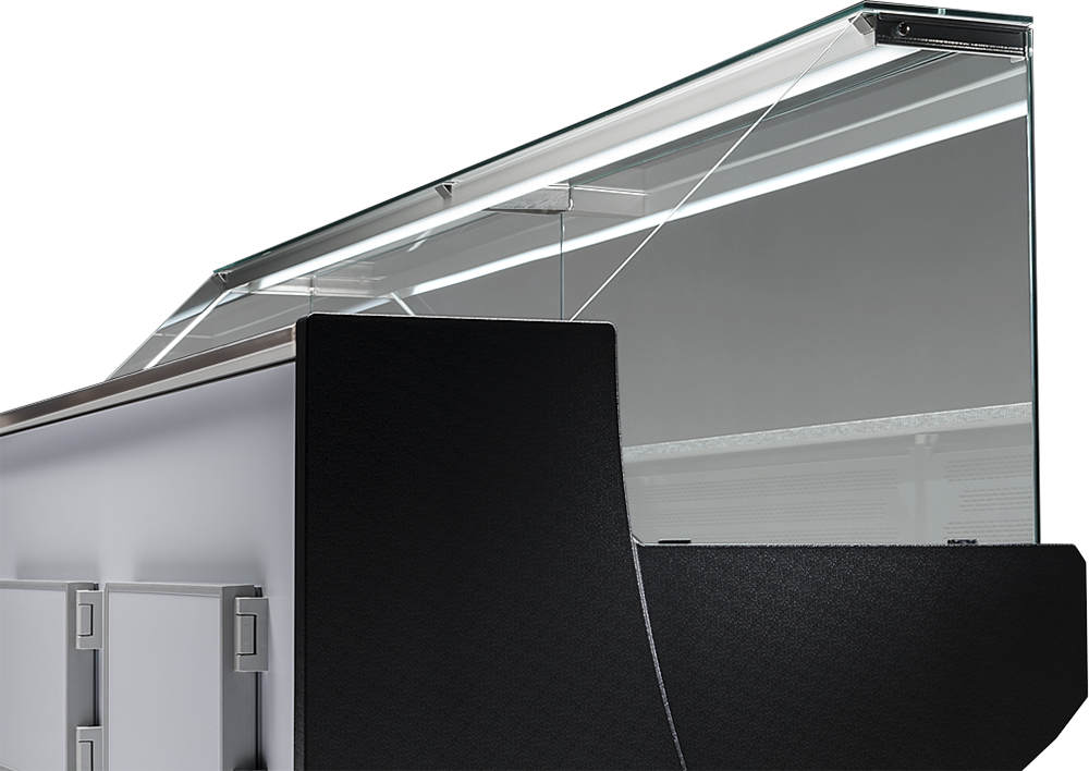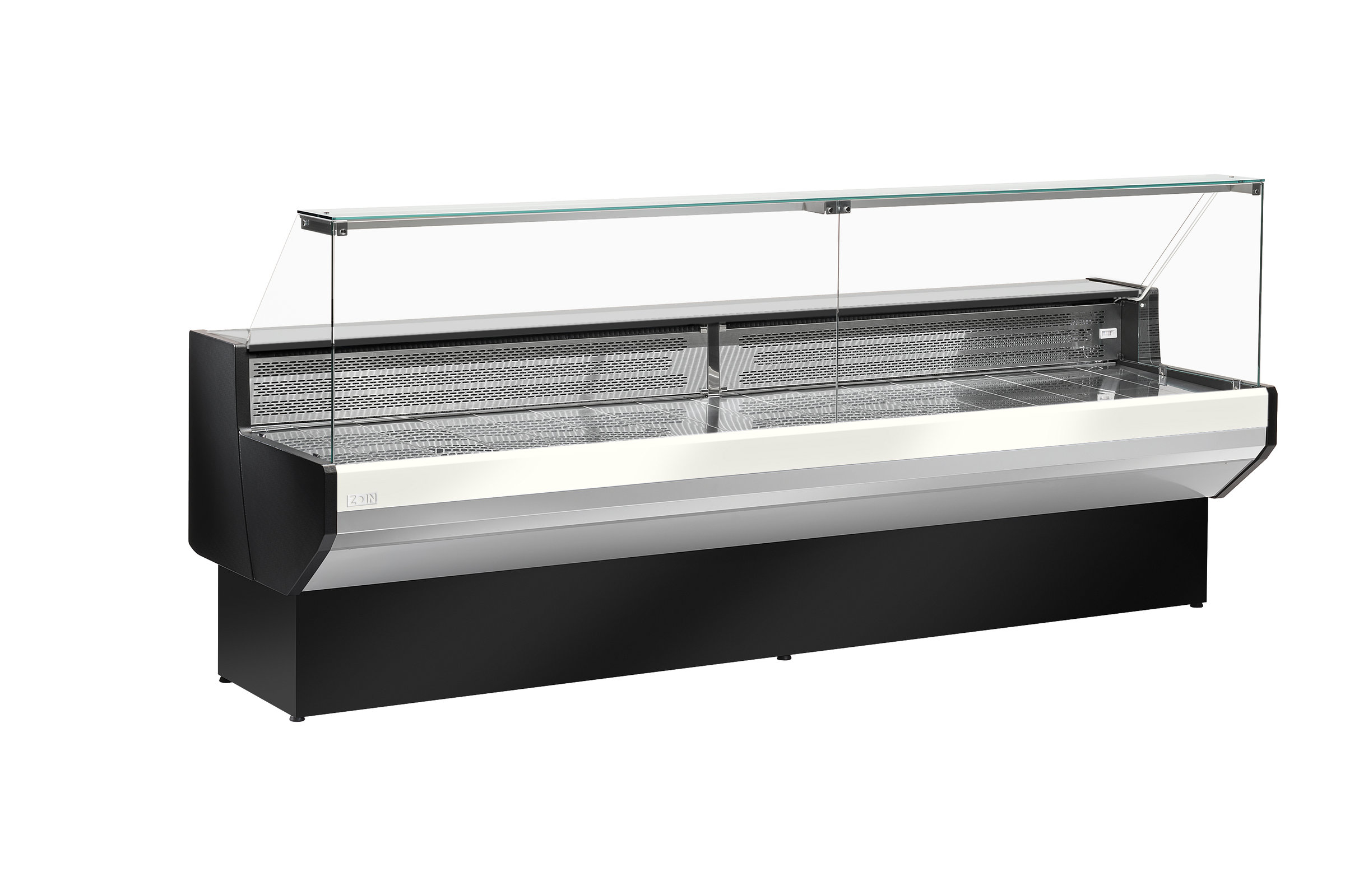 Frischwarentheke Pablo 3 mit Umluftkühlung und Frontblende aus elegantem Edelstahl Scotch Brite I 301 gefertigt mit Glasaufbau und gebogener Frontscheibe aus Sicherheitsglas. Die Kühltheke Pablo verfügt über eine elektronische Steuerung mit digitaler Temperaturanzeige und einer separat schaltbaren energiesparenden LED – Auslagenbeleuchtung. Die Ausstellungsfläche gefertigt aus Edelstahl CNS 18/10 (Chromnickelstahl (AISI 304)) bietet mit einer Tiefe von 640 mm ausreichend Platz. Zusätzlicher Stauraum bietet die Kühltheke über ein gekühltes Reservefach mit einer maximalen Tiefe von 560 mm und einer Höhe von 220 mm. Je nach Größe der Frischwaren-Kühltheke ist derZugang zum gekühltem Reservefach mittels 1 oder 2 Türen möglich. Im Bedienbereich verfügt die Kühltheke über eine Edelstahlarbeitsplattemit einerTiefe von 280 mm. Der Verdampfer der Kühltheke ist natürlich für eine langeLebensdauer beschichtet. Die Abtauung der Kühltheke erfolgt automatisch, dabei wird das Tauwasser in der beiliegenden Tauwasserschale für die bauseitige Entsorgung aufgefangen. Weiterhin verfügt die Kühltheke über höhenverstellbare Ausgleichsfüße um Bodenunebenheiten vor Ort auszugleichen. Die Frischwarenkühltheke ist mit einer Frontblende in Scotch Brite I 301 versehen. Die untere Frontblende ist in grau lackiert, die Seitenteile und Stoßleiste in Kunststoff und grau gefertigt damit bietet diese Theke einen vielfältigen Einsatzsatzbereich auch im Ladenbau.