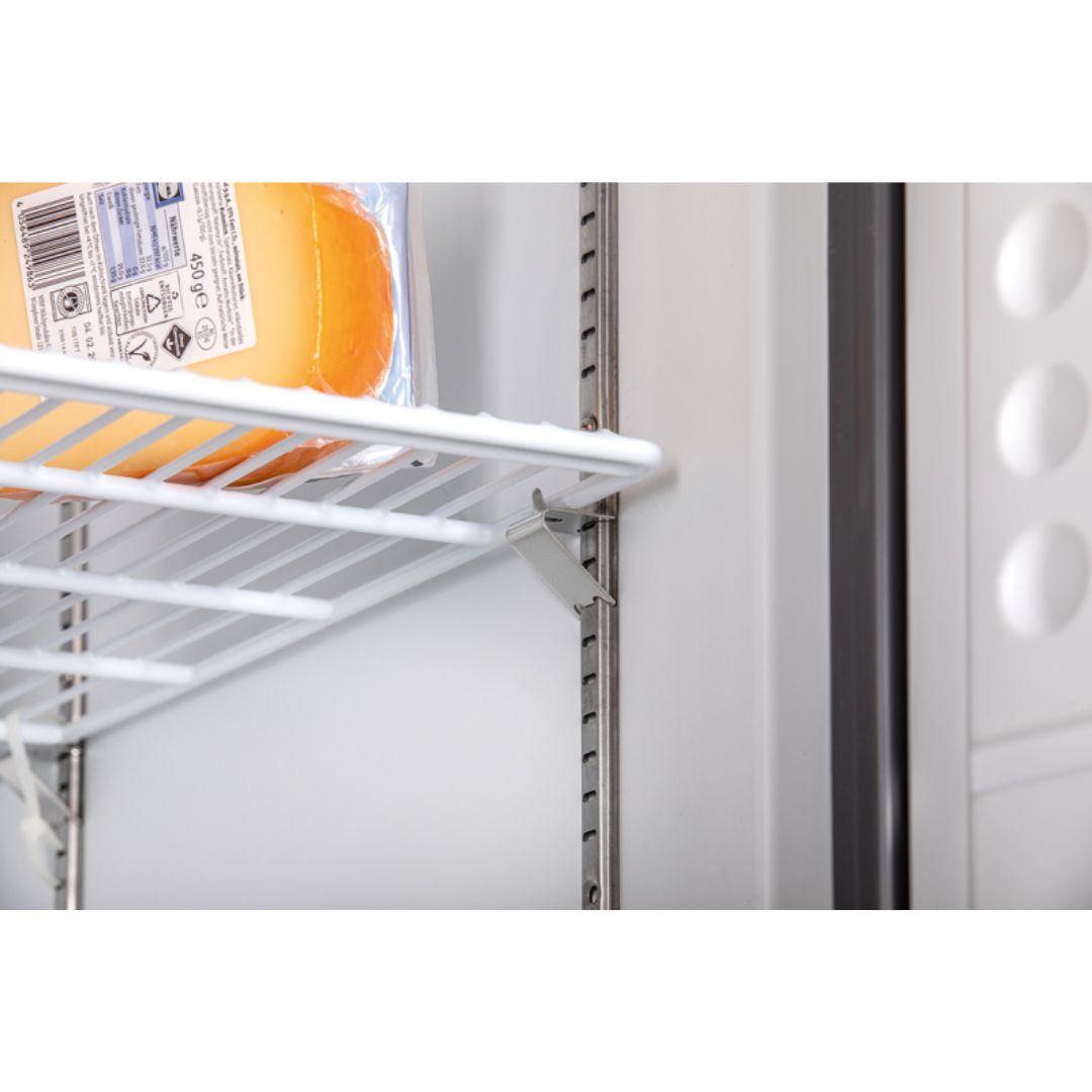Umluft-Gewerbekühlschrank mit zwangsbelüfteten Kondensator im Maschinenraum. Das Gerät ist mit einem Luftleitblech ausgerüstet für eine effektivere Verteilung der kalten Luft im Innenraum. Kunststoff-Innenbehälter ist mit Rasterschienen versehen um die mitgelieferten Roste bestmöglich dem zu kühlenden Produkt anzupassen um eine optimale Raumausnutzung zu erhalten. Für eine optimale Luftführung im Kühlschrank befindet sich im Bodenbereich hinter jeder Tür ein zusätzlicher Rost. Die Tür ist abschließbar und mit einer Magnetsteckdichtung versehen, somit servicefreundlich ohne Werkzeug wechselbar. Die elektronische Steuerung und die digitale Temperaturanzeige sind in der Frontblende integriert. Höhenverstellbare Füße.