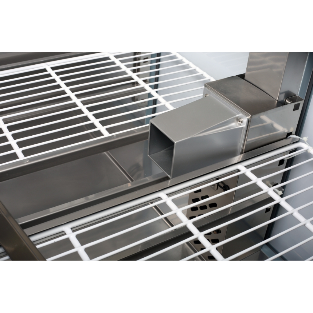 Umluftkühltisch mit 3 seitig eingeschäumtem Verdampfer und 2 Umluftventilatoren für die bessere Kaltluftverteilung, Temperatur mittels eletronischem Thermostat regelbar und digitale Temperaturanzeige. Beleuchteter Ein-/Ausschalter. Der Fettfilter befindet sich hinter der abschließbaren Maschinenblende, ist leicht herausnehmbar und waschbar. Rostmaß GN 1/1. Maximal können 5 Roste inkl. 5 Paar kippsichere Auflageschienen ( Zubehör ) pro Türfach eingebracht werden. Für eine optimale Luftführung im Kühltisch befindet sich im Bodenbereich hinter jeder Tür ein zusätzlicher Rost. Türdichtungen servicefreundlich ohne Werkzeug wechselbar. Boden als Wanne ausgebildet mit mittigen Tauwasserablauf. Arbeitsplatte allseits abgekantet, nicht abnehmbar.