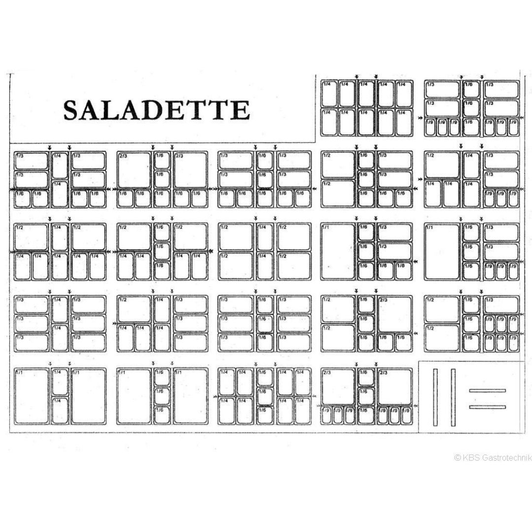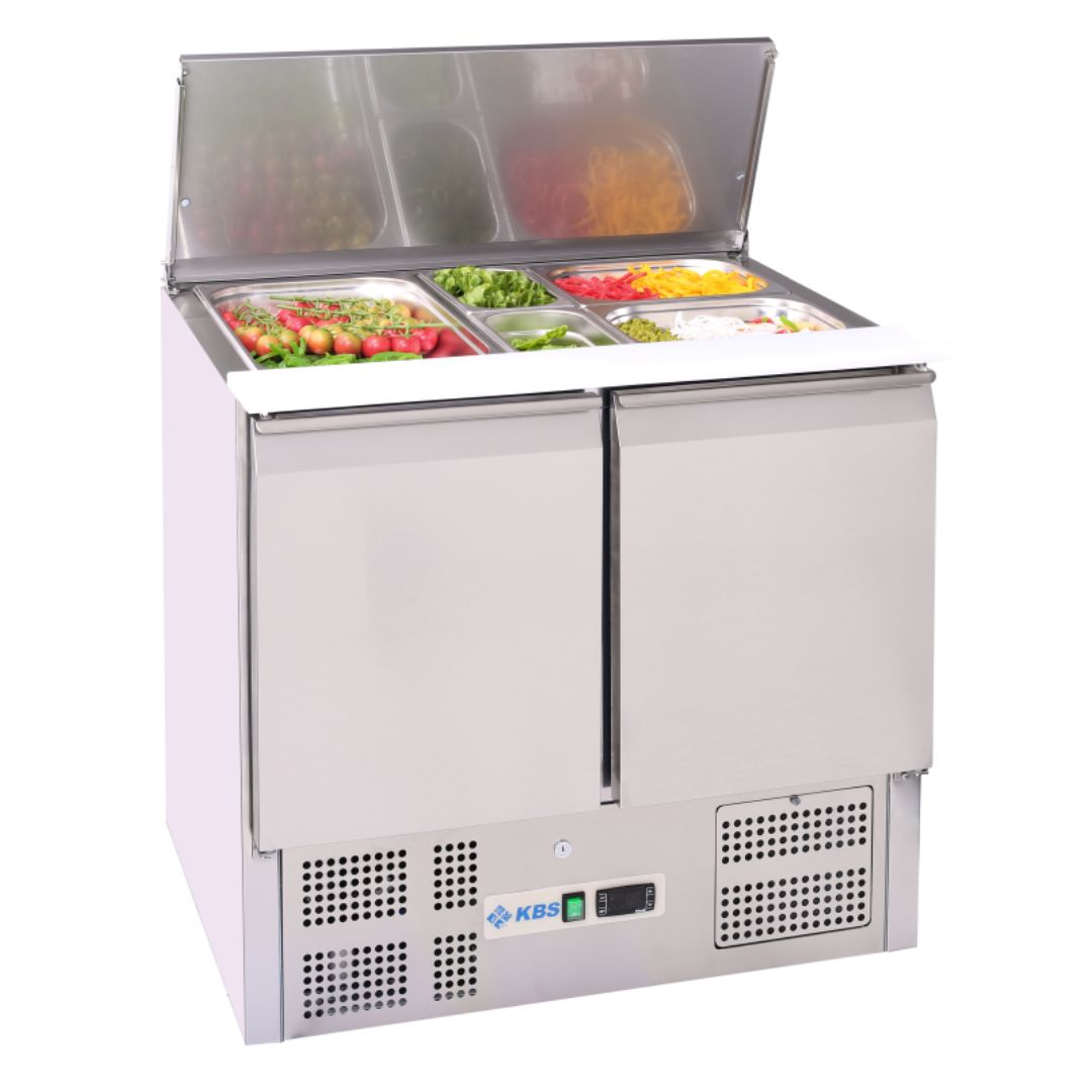 Saladette mit 3-seitig eingeschäumtem Verdampfer. Isolierung 45 mm; dadurch geringerer Energieverbrauch. Temperatur mittels elektronischem Thermostat regelbar. Digitale Temperaturanzeige. Beleuchteter Ein-/Ausschalter. Der Fettfilter befindet sich hinter der abschließbaren Maschinenblende, ist leicht herausnehmbar und waschbar. Rostmaß GN 1/1. Maximal können 5 Roste inkl. 5 Paar kippsichere Auflageschienen (Zubehör) pro Türfach eingebracht werden. Für eine optimale Luftführung im Kühltisch befindet sich im Bodenbereich hinter jeder Tür ein zusätzlicher Rost. Türdichtungen servicefreundlich ohne Werkzeug wechselbar. Schneidbrett aus Polyethylen, Boden als Wanne ausgebildet und konisch zulaufend, mittig Tauwasserablauf. Lieferung ohne GN-Behälter.